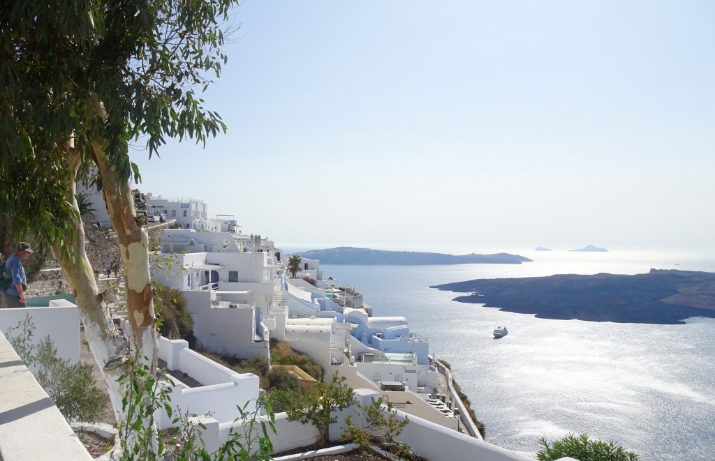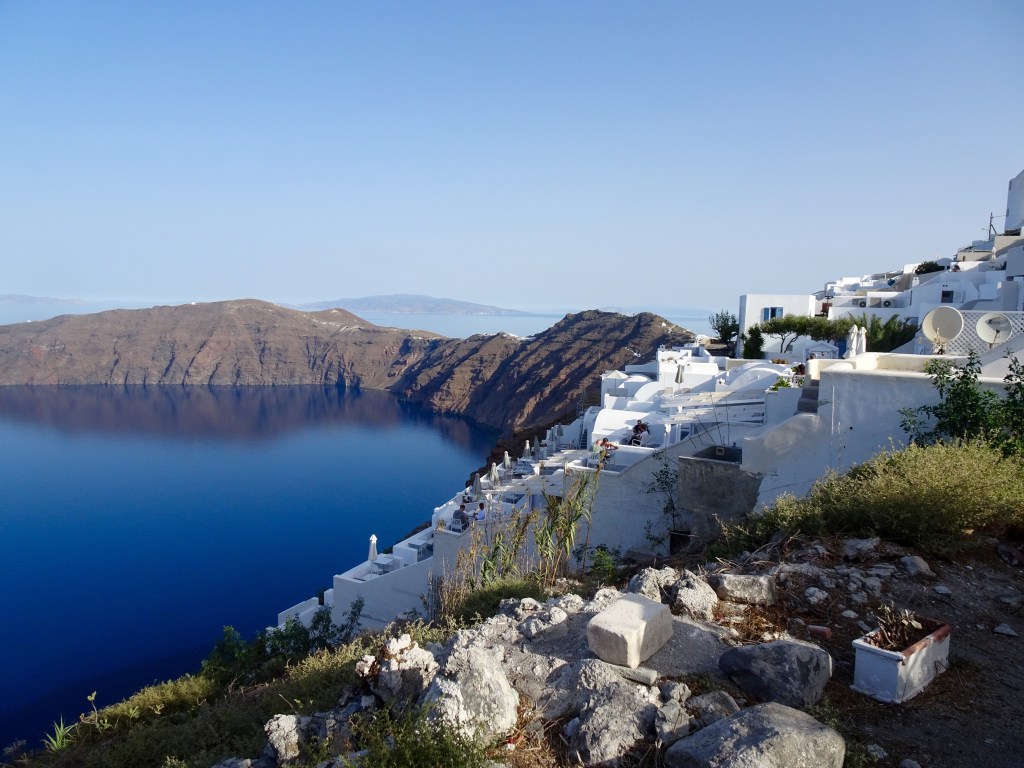 The island is curled like a shrimp, and inside the curl is the crater of a drowned volcano. The sheer cliffs that rise up from the sea form the caldera, and both Oia and Fira sit astride the caldera ridge.