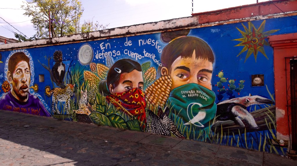 This one is asking for Mexico to allow citizens to control their own land and for women to control their own bodies. Women’s rights are a common theme here – posters about violence against and murder of women are everywhere.