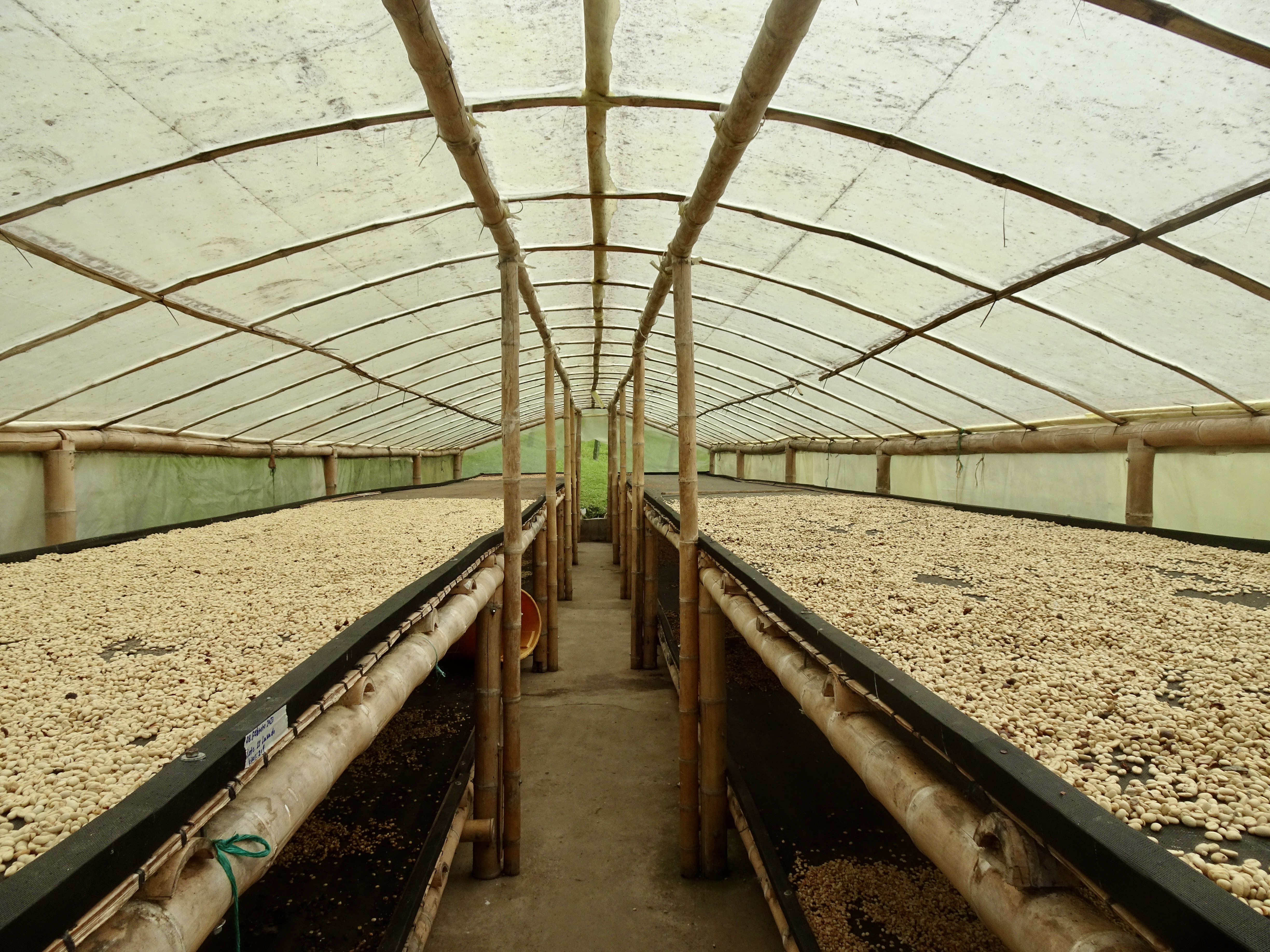 We examined out pitiful little offerings, and cracked open the “cherry” to reveal two beans within. They have a sweet “musilage” covering them, so we were led to the drying greenhouses to see the drying process in action. Beans are laid out and turned several times a day, until they are dry and then ready for roasting.