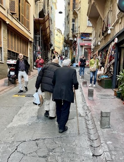 Our apartment is several blocks up to the top of a hill. There is nothing to do but heads-down and bend into the grade. Today as we puffed and wheezed, we came upon these two old gents.