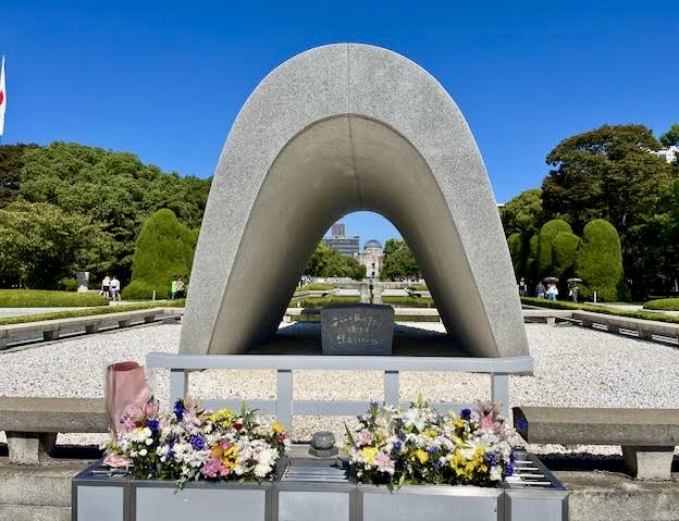 There is a broad walkway from the museum toward the A-Bomb Dome; with the distinctive shape of the Memorial Cenotaph, which holds the names of all people killed by the bomb.