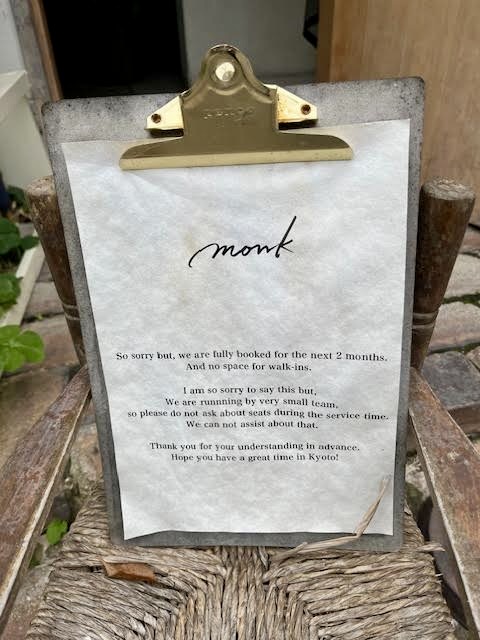 Lots of other things to take in along the way, such as the note outside this restaurant, monk. This 14-seat eatery, with tasting menus of $154 CA, can no longer accommodate the demand. In a city and country filled with singular dining experiences, has over-tourism also over-burdened the restaurant business?