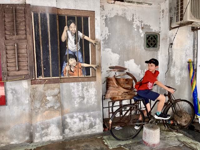 But one of the most entertaining aspects of visiting this Malaysian island it to play the “Where’s Waldo?” game of hunting down famous street murals. Some of them have proven to be quite elusive, but here are a collection of a few notables, some with the added feature of “props”, which encourage tourists to insert themselves into the scenes.