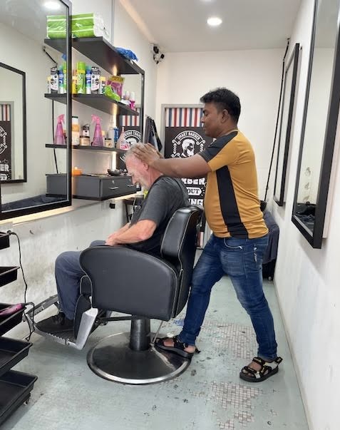 As uncomfortable as Stephen was, it was quite hilarious for me to watch, particularly as the barber was flipping him this way and that, slapping cream all over his face and head, then submitting him to a soaking at the sink. It was an incredible show. Indian barber – look it up.