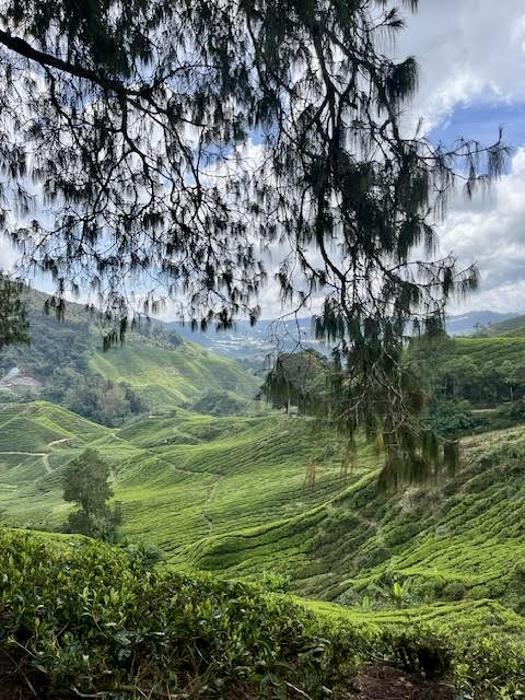 The major difference between our experience in India and here in Malaysia is that in India we stayed in a hotel overlooking the tea fields and were free to wander about the dusty paths, up to our necks in tea plants. We had breakfast every morning on a deck overlooking green hills just like the ones in the photo above.