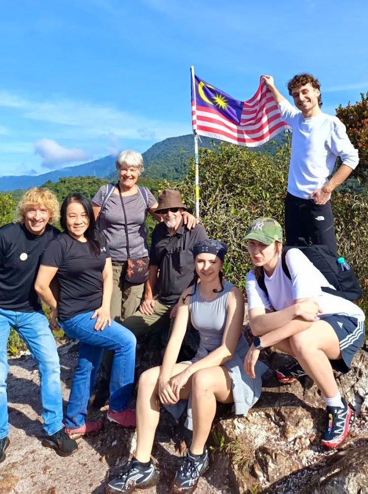 Our fellow travellers were three young Polish kids, a couple from Singapore and Kansas, and a couple from Kuala Lumpur. Here we are at the summit of our hike, appearing to plant the Malaysian flag in triumph.
