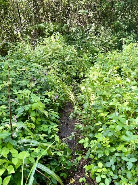 The marker has been there for a few years, and I think it has been at least that long since this trail was tended to. We waded in, thinking it would eventually open up, but it never did. Vines snapped at our ankles and all I could think of was “pit vipers.” Or even, “rats“. Amazingly, no bugs, but it was not a comfortable experience.