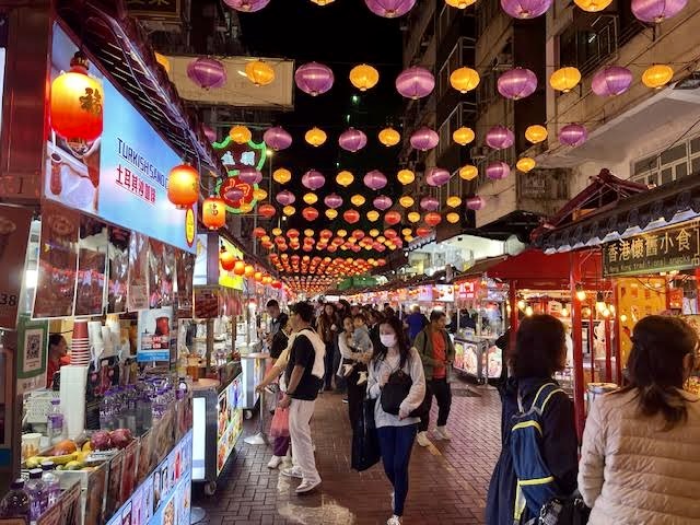 The Temple Street Night Market in Kowloon is a lot of fun. Several food stalls serve up everything from noodles to dumplings to samosas to fruit smoothies.